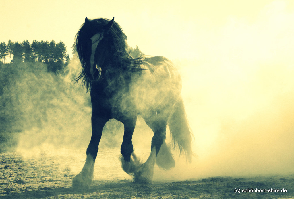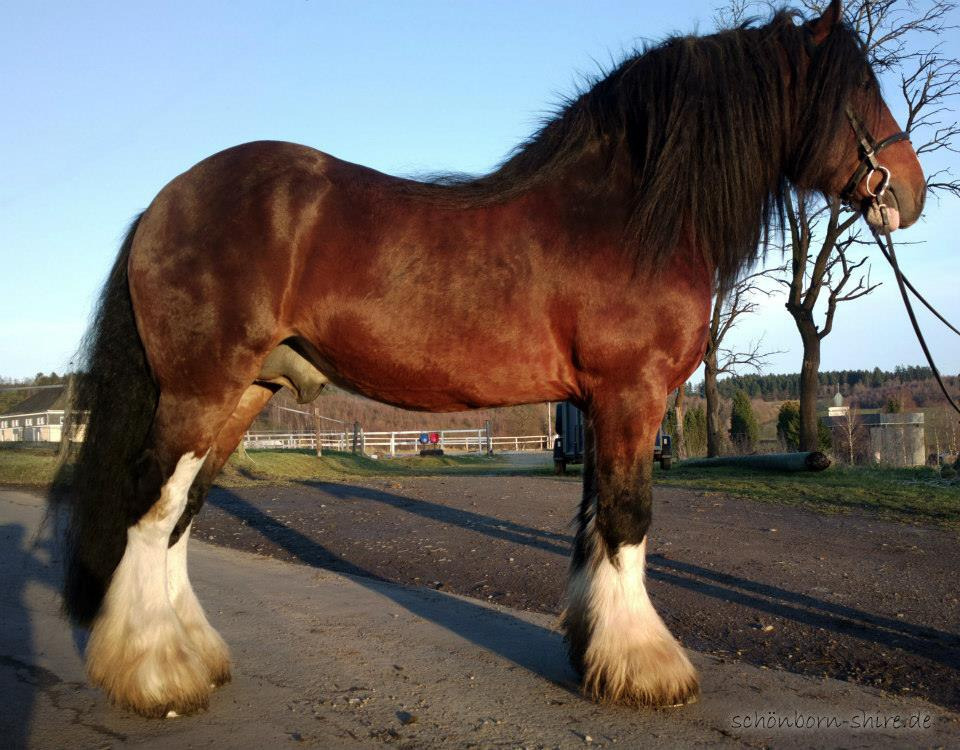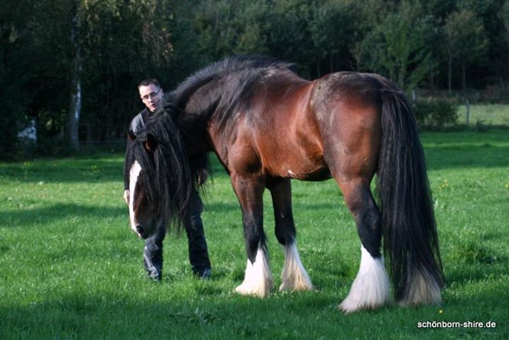 Ekzemfrei mit enorm viel Langhaar. Er hat ein inzuchtfreies Pedigree, wie man es nur selten bei Shire Horses findet. Er vererbt sich groß, seine Fohlen sind Rappen und Braune.